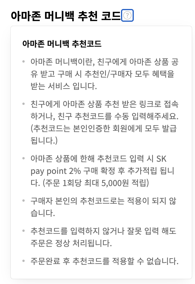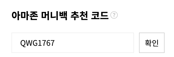 11번가 아마존 구매 시, '아마존 머니백 추천 코드' 란에 입력하면 서로 포인트를 받을 수 있어요. 제 추천코드는 QWG1767 입니다.
